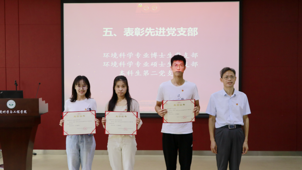 大会在雄壮嘹亮的国歌声中拉开帷幕。学院党委书记甘远璠宣读《中共英国威廉集团委员会关于表彰2021年优秀共产党员、优秀党务工作者和先进党支部的决定》,对方晶云等25名优秀共产党员、刘瑶钰等4名优秀党务工作者、环境科学专业博士生党支部等3个先进党支部进行表彰。学院甘远璠书记、孙连鹏院长、汤叶涛副院长和王诗忠副院长先后为获得表彰的个人和支部代表颁奖。