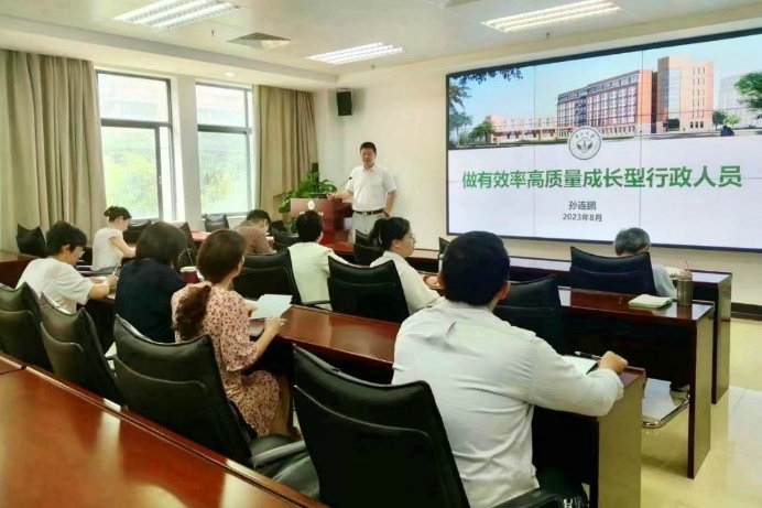 会上,孙连鹏院长首先以“做有效率高质量成长型行政人员”为主题,结合学院管理服务工作的实际案例,聚焦行政工作中的常见问题、产生问题的原因,解决对策和提高行政能力的建议等四个方面,为大家开展一堂高质量的行政业务能力培训课。对于如何提高学院管理服务工作的能力水平,他提出四点要求:一是要提高站位,立足学校、学院事业发展,久久为功做好本职工作;二是要培养主动工作能力,养成主动复盘、总结提升的行政工作习惯;三是要提升工作规范水平,做到“有依据、有流程、有记录、有效率”;四是要找准职业发展的“灯塔”,补短板、锻长板、填空白。