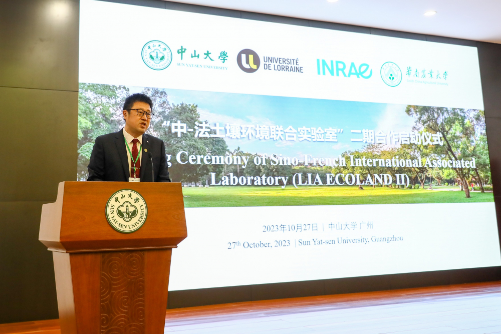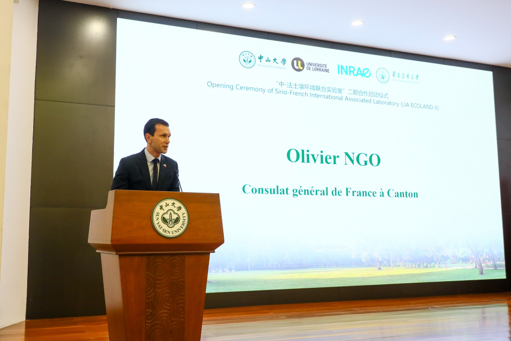 法国驻广州总领事馆科技与高等教育领事Olivier NGO先生随后致辞,对ECOLAND二期合作表示热烈祝贺。他指出,这一合作既是科学领域的合作,还是中法友好关系的象征,法国驻华大使馆以及法国驻广州总领事馆会鼎力支持,为项目开展保驾护航。