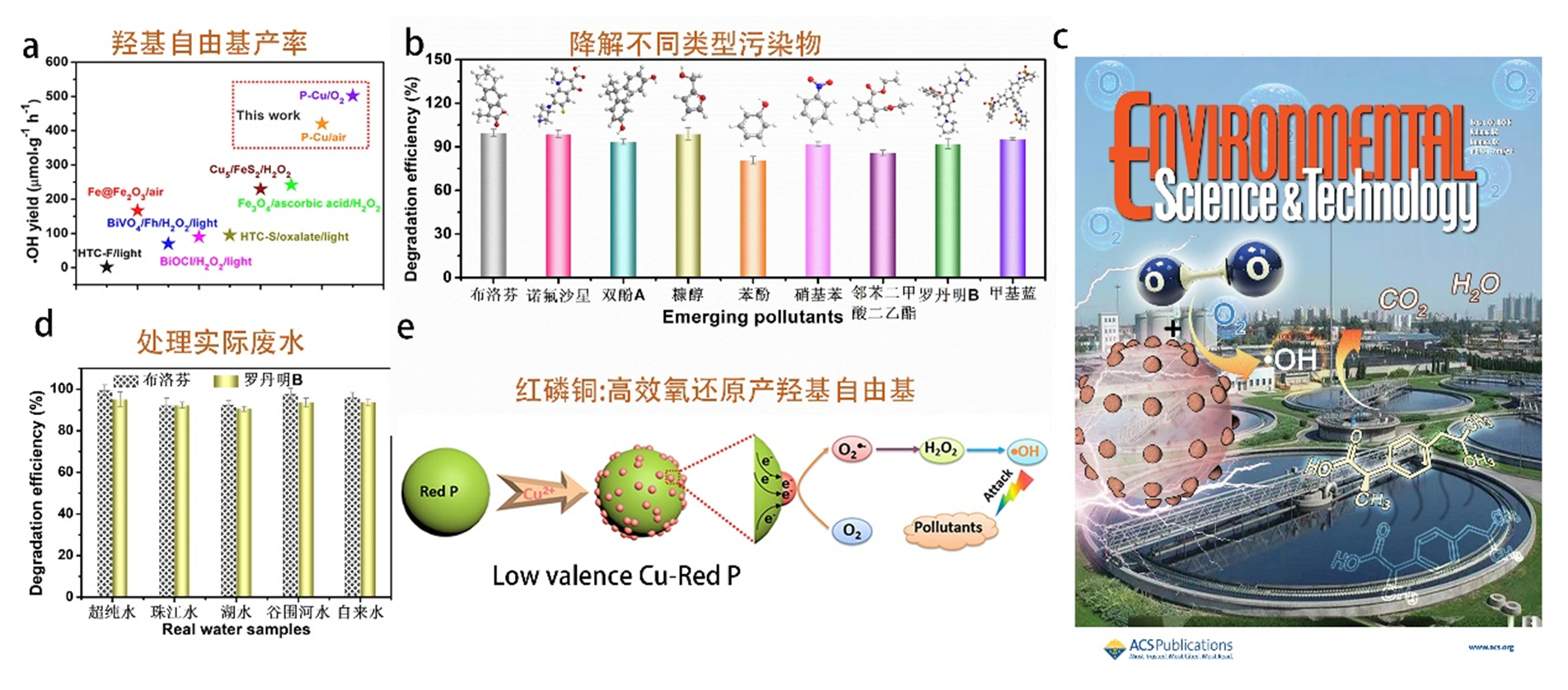 氧气占大气的21%,但氧气活化难、需要外加光与电能驱动、氧气利用率低。基于此,我们开发了等多种材料,可实现在无光无电下高效活化氧气产双氧水与羟基自由基。我们发展合成稳定单原子金属的方法(J. Am. Chem. Soc., 2022, 144, 22075)。利用该方法,首次得到稳定的一价铜Cu+,并自发高效还原氧气产羟基自由基。在无光无电输入下高效活化氧产生高达502 mmol g-1 h-1的羟基自由基,转换频率(Turnover frequency)高达0.78 h-1,是目前固体催化剂利用氧气自发活化产羟基自由基的最高记录。该材料在宽pH范围(2-10)对珠江水、谷围河水、湖水、自来水等实际水体中的系列污染物(布洛芬、诺氟沙星、双酚A、苯酚、硝基苯、邻苯二甲酸二乙酯等)高效去除。相关工作作为封面文章发表在顶级环境期刊上(Environ. Sci. Technol., 2023, 57 (12), 5024-5033)。相关技术获授权专利3项(ZL202110647997.X,ZL202110654352.9,ZL202110531578.X)。