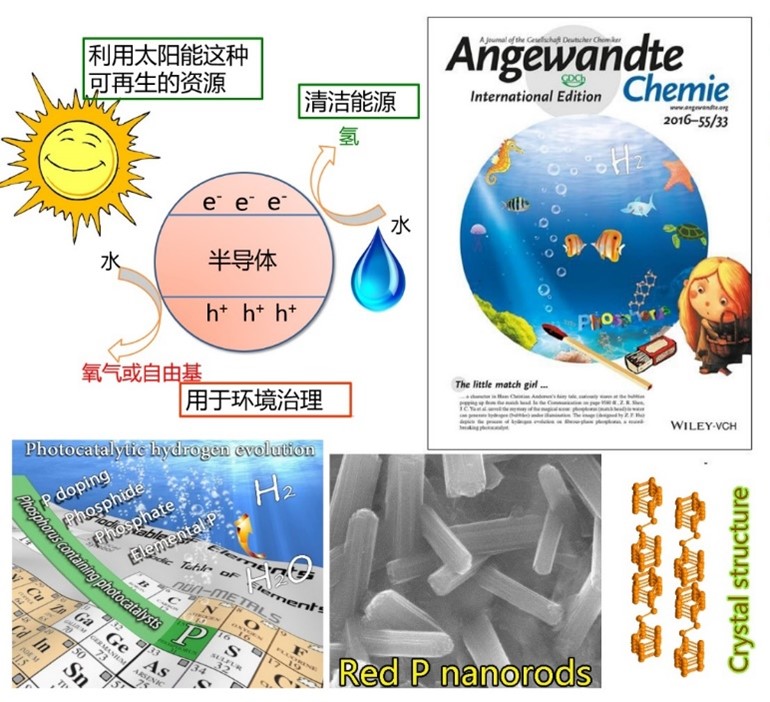 磷元素是生态环境中非常重要的元素。一直以来,红磷被认为是一种消耗品,往往用于制备火柴和阻燃剂。但最近发现,在阳光下,红磷可把水分解,产生清洁能源氢。与其他化学燃料相比,氢的能量密度非常高,氢无毒无害,燃烧后只有水,是一种新型的对环境无污染的高效洁净能源。这为红磷的应用打开了一个崭新的思路。成功合成了纤维相红磷,这种高度结晶性的红磷产氢效率比商用无定形红磷高800倍!这比之前报道的所有的元素光催化剂的产氢率都高。相关工作发表在国际顶级期Angewandte Chemie International Edition(2016, 55, 9580)上。该文章被编辑选为当期杂志的 hot paper,并入选为 cover。此外,通过理论计算,分析了纤维相红磷的半导体性能,证明其在光照下产生的空穴也可以把水氧化成氧气或自由基,而自由基像羟基自由基等可以降解环境污染物,相关研究发表在Small(2021,2008004)上。